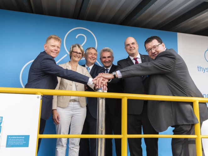 Bundesforschungsministerin Anja Karliczek (2. v. l.) ist beim Produktionsstart zugegen