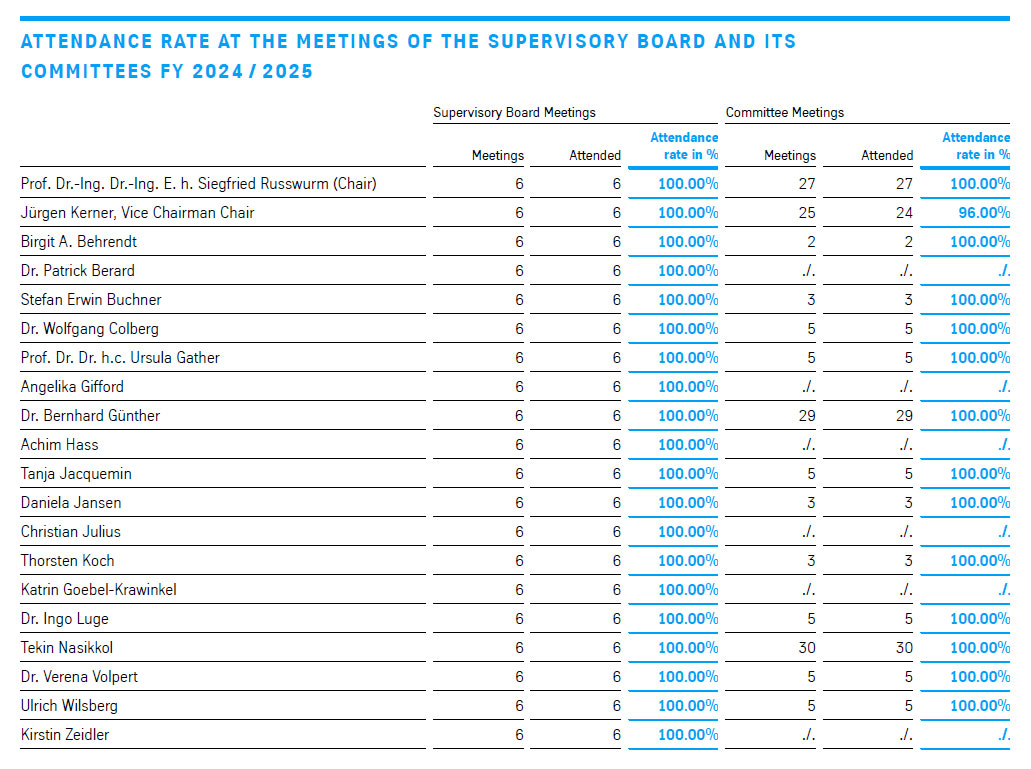 The attendance rate at the meetings of the Supervisory Board and its committees was 99.6%. The following table shows attendance in individualized form: see table.